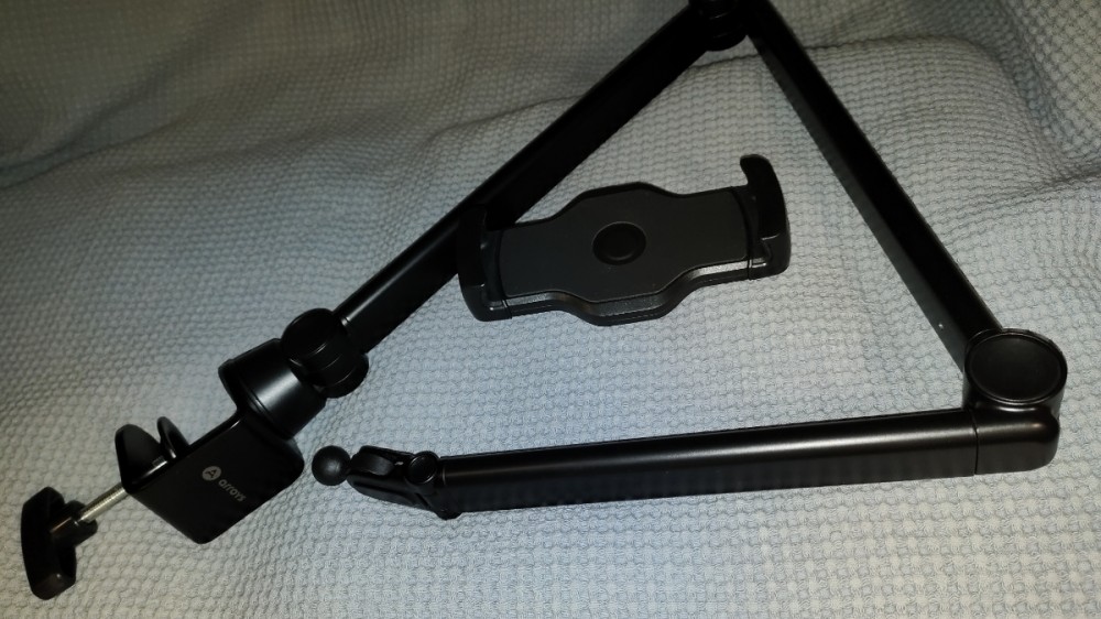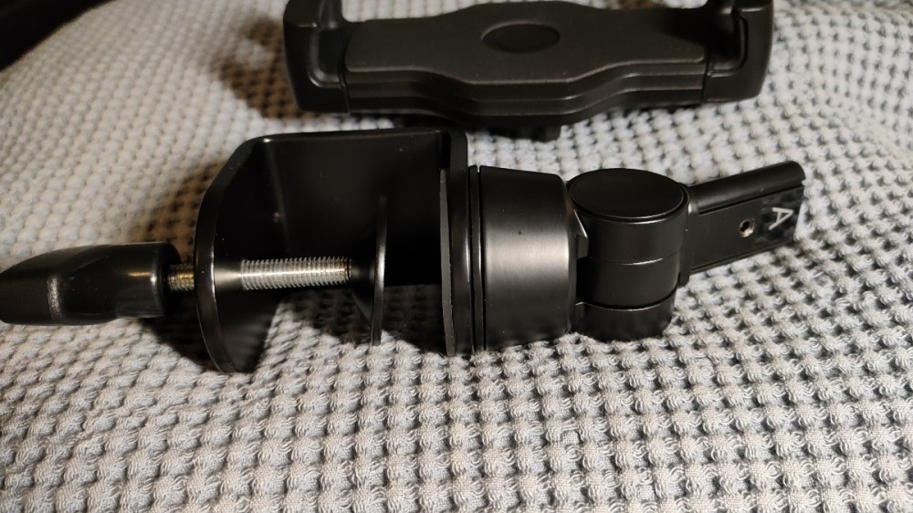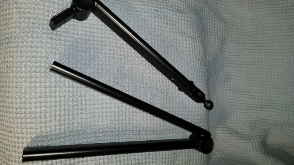 Струбцина и штанга держателя выполнены из металла. Вес устройства может находиться в пределах 500 -1000 гр и зависит от угла наклона штанги и усилия вращения шарнирных соединений, установленных пользователем. Держатель можно собрать в двух вариантах: две и три секции. В полном сборе используются три секции длиной 280 ,280 и 200 мм. В укороченном варианте используются две секции по 280 мм. Все перестановки делаются с помощью комплектных шестигранных ключей.