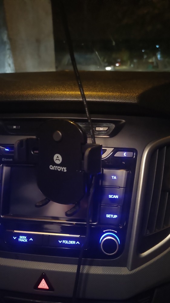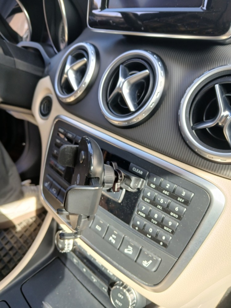 Держатель имеет автоматический зажим, подходящий для смартфонов с шириной экрана от 55 до 85 мм. Он закрывается автоматически при установке смартфона держатель. Смартфон нажимает корпусом встроенную на лицевой панели кнопку и захват смартфона закрывается. Чтобы вынуть смартфон из держателя, надо нажать две боковые кнопки и зажим откроется. Все это делается одной рукой, что очень удобно. Если экран смартфона широкий, на кнопки надеваются удлинительные колпачки.