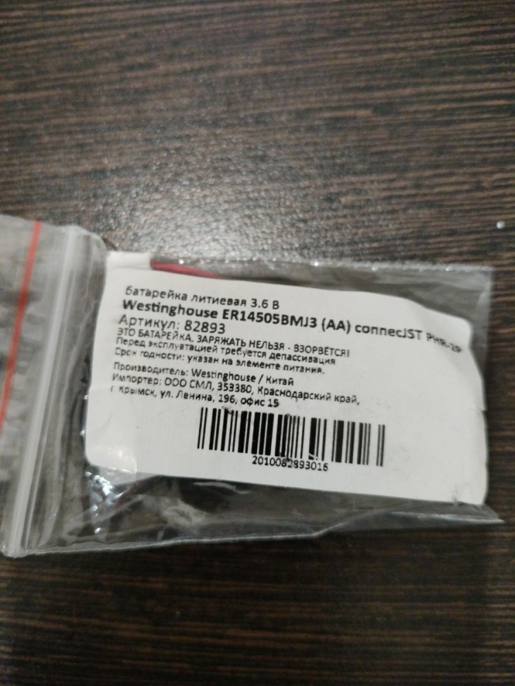 Westinghouse ER 14505BMJ3 (AA) connector JST PHR-2P - высококачественная литиевая батарейка 3.6 В с коннектором. Это батарейка, а не аккумулятор. Не заряжать - взорвется!
