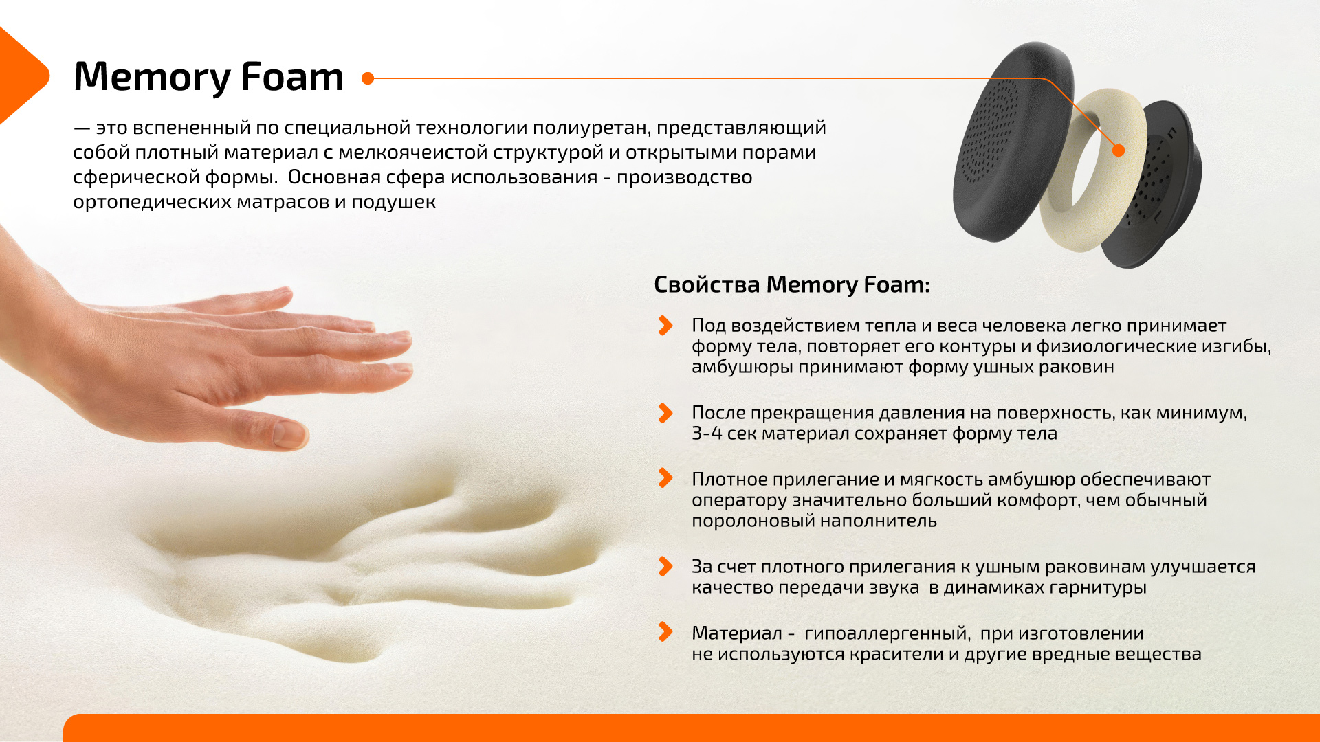 Амбушюры выполнены из качественной экокожи и имеют вставки из Memory Foam, пеноматериала с эффектом памяти. Он повторяет линии ушной раковины, обеспечивая ее полное облегание. В сравнении с обычными вставками из поролона разница в комфорте ощущается мгновенно. Кроме того, за счет плотного прилегания существенно улучшается качество звука. Наушники звучат более глубоко и естественно.